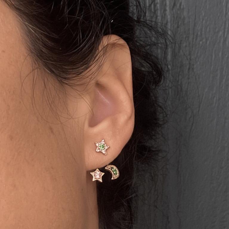 Each delicate star is adorned with emerald and sapphire stones, creating a subtle sparkle reminiscent of stars shining in the night sky.