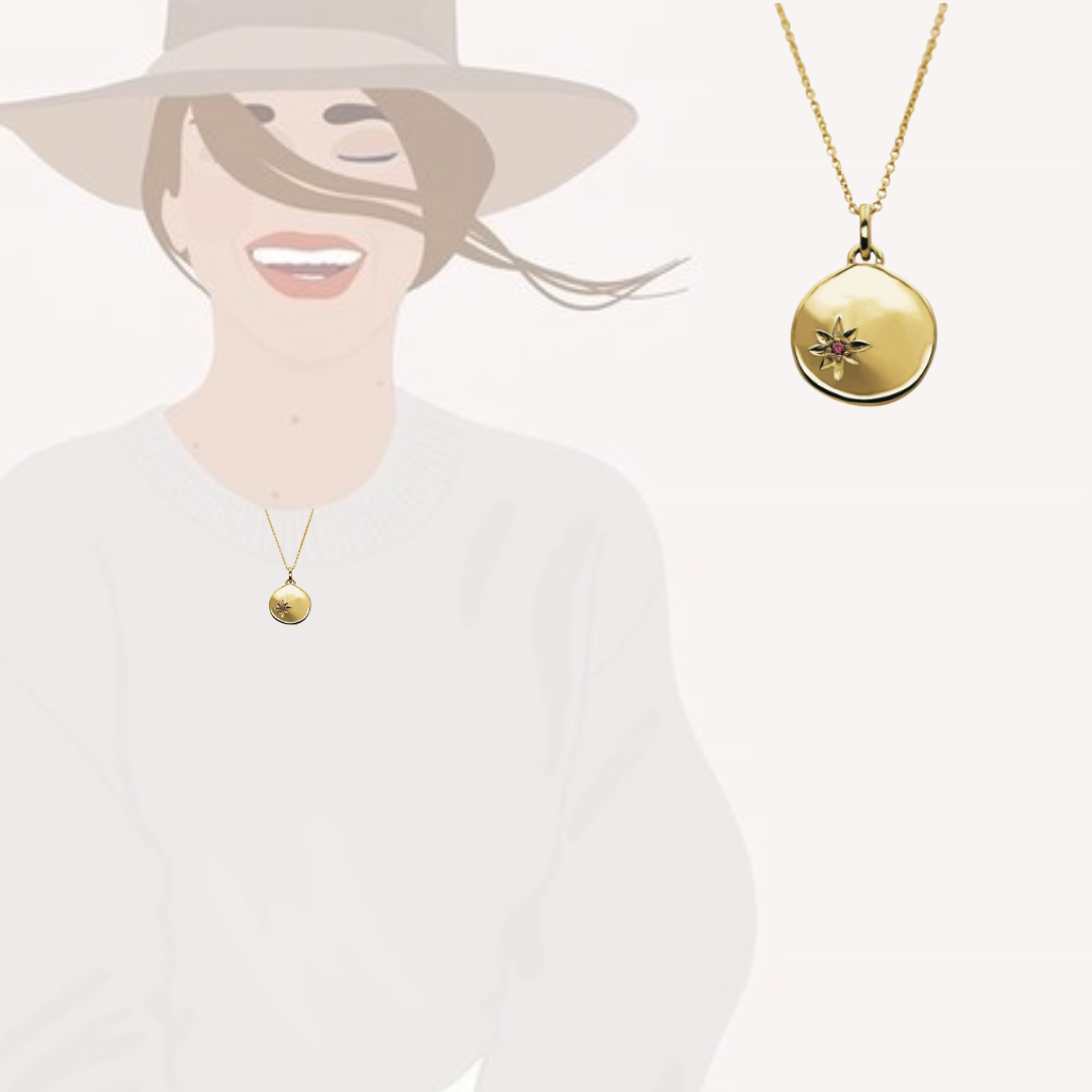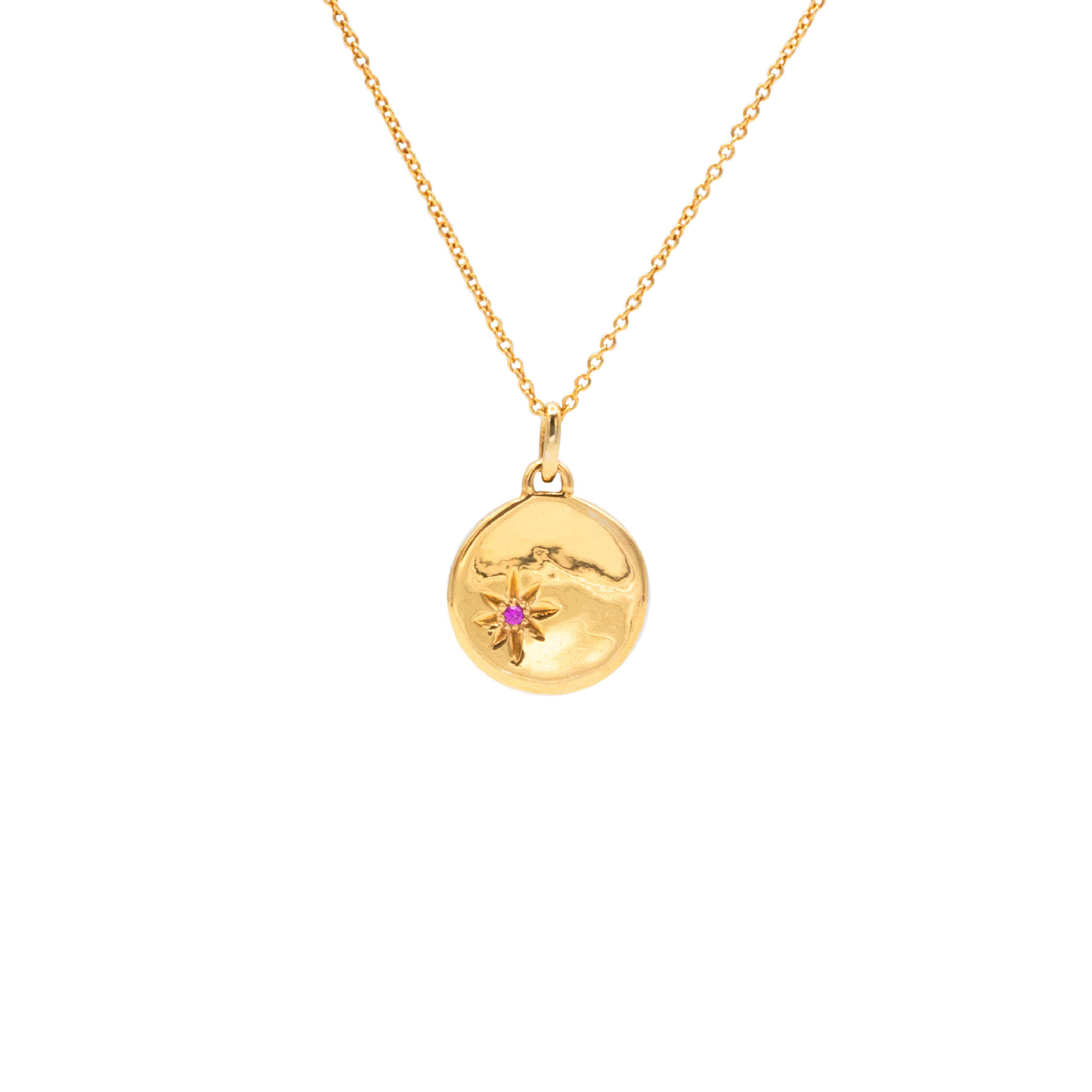 Explore our Santorini medallion, inspired by the starry skies of this Greek island. Featuring a star-shaped created ruby, this gold-plated piece evokes clear nights where the evening star twinkles above whitewashed houses. A unique design that adds a radiant touch to your collection.